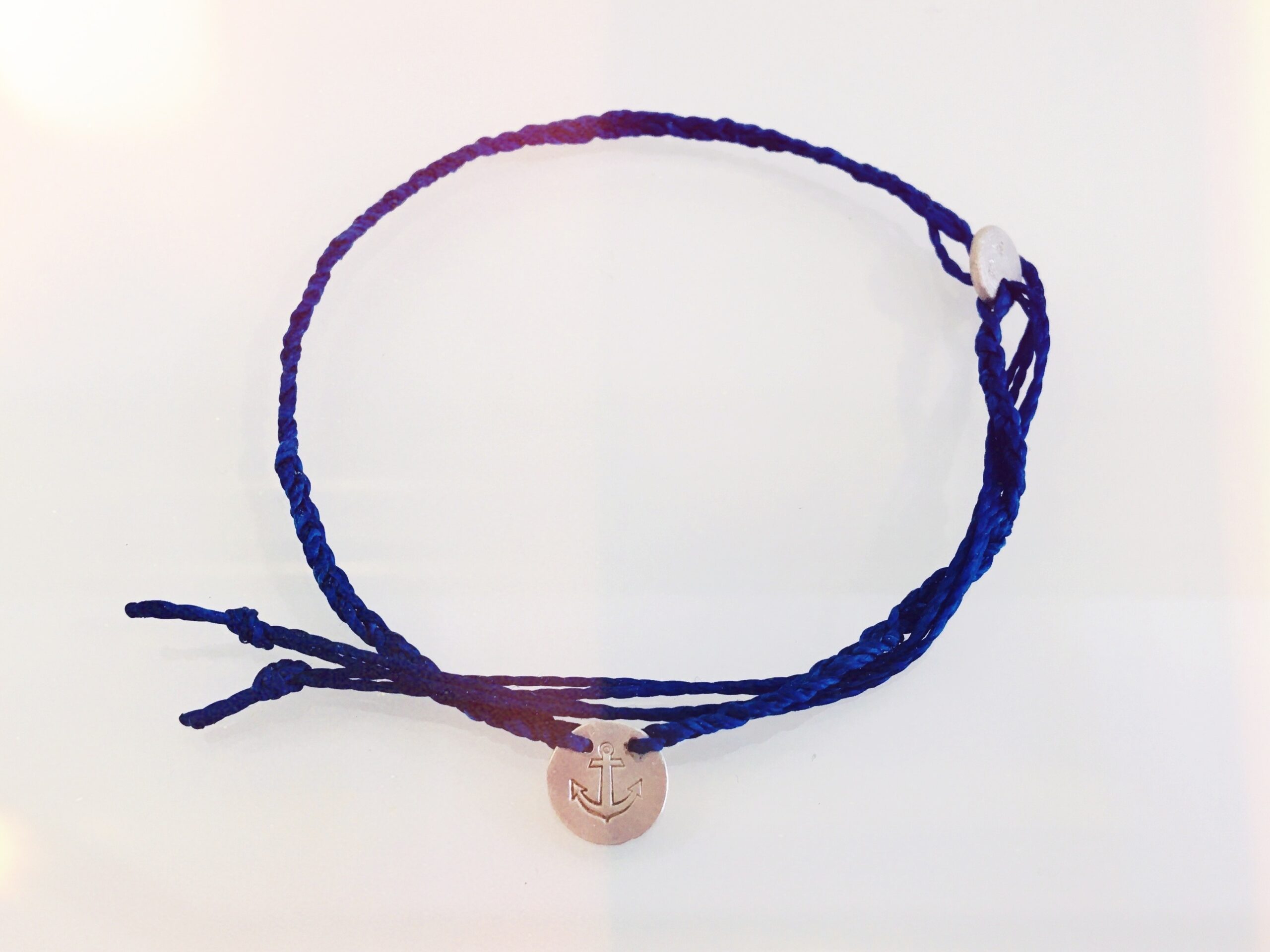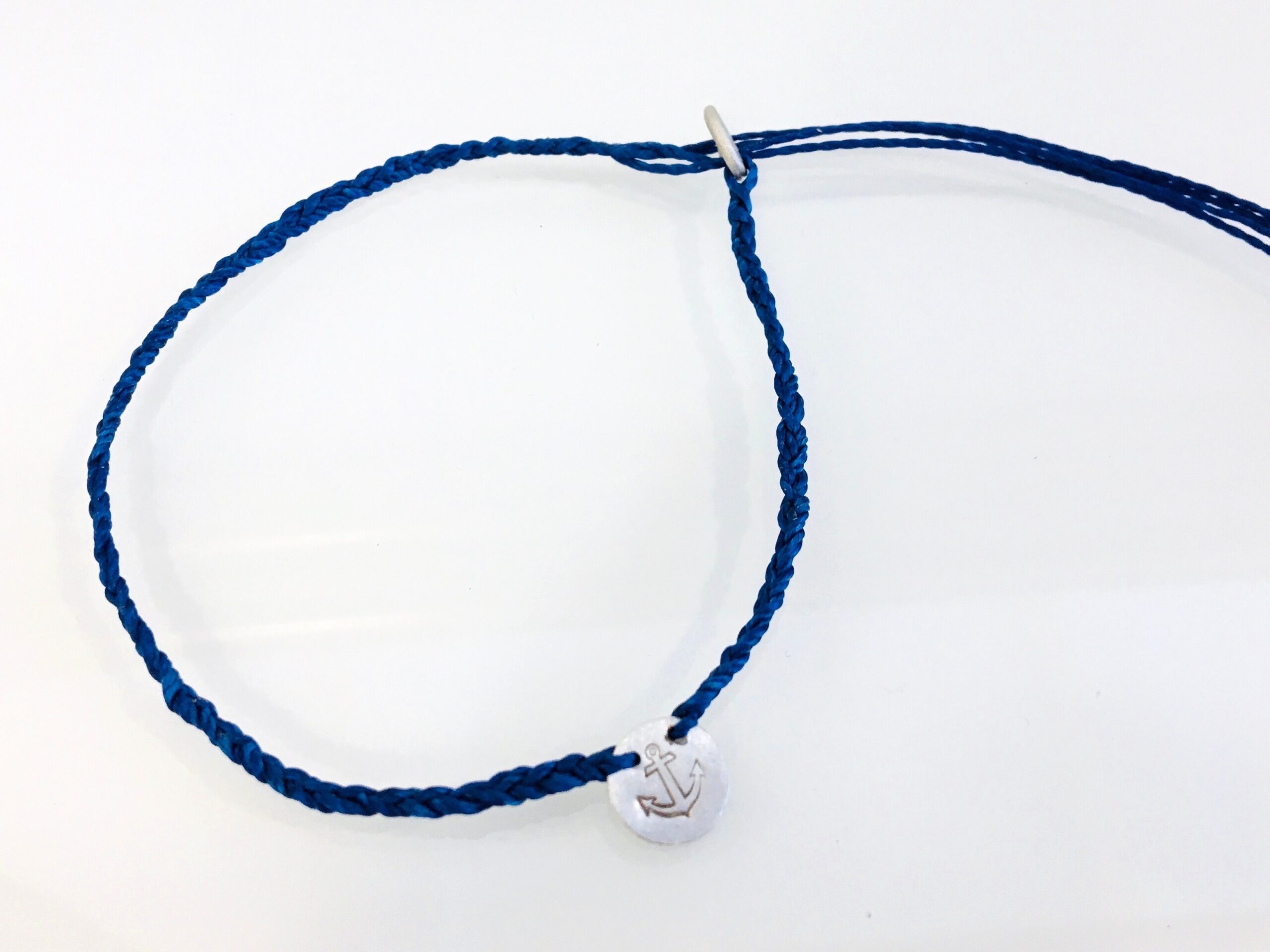 Maritimes Armband mit silbernem Blättchen auf dem ein eingestanzter Anker ist. Der Anhänger wird auf ein besonders langlebiges Wachsband geflochten!